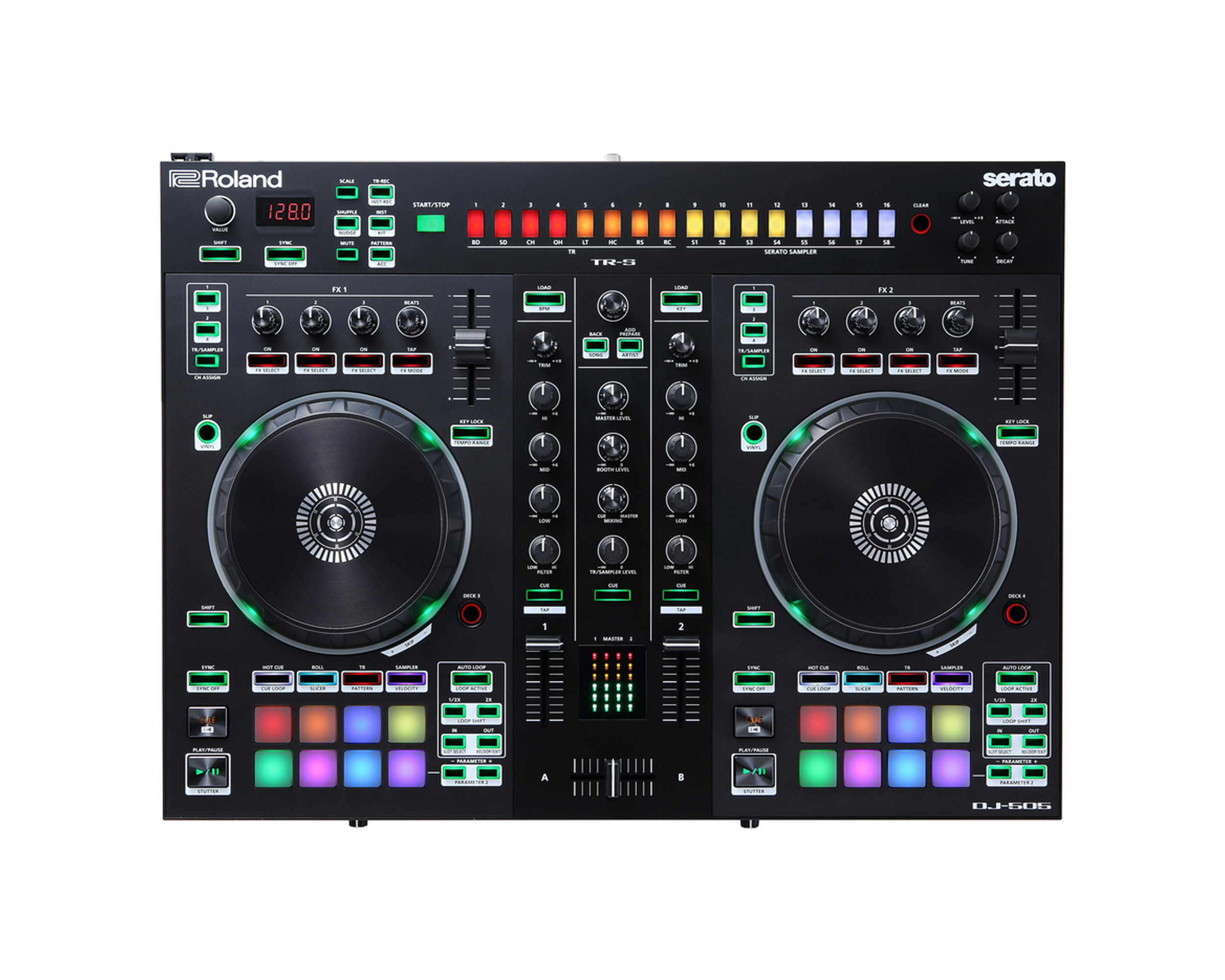 The Roland DJ-505 is a two-channel, four-deck Serato DJ controller that blends the advanced performance capabilities of Serato DJ with the legendary sounds and sequencing of Roland’s TR-808, TR-909, TR-606*, and TR-707* drum machines. The DJ-505 gives you the tools to move beyond mixing music to creating beats and rhythms on the fly that sync to your Serato DJ tracks, enabling the creation of unique transitions, live remixes, beefed-up classic tracks, or your own original music.