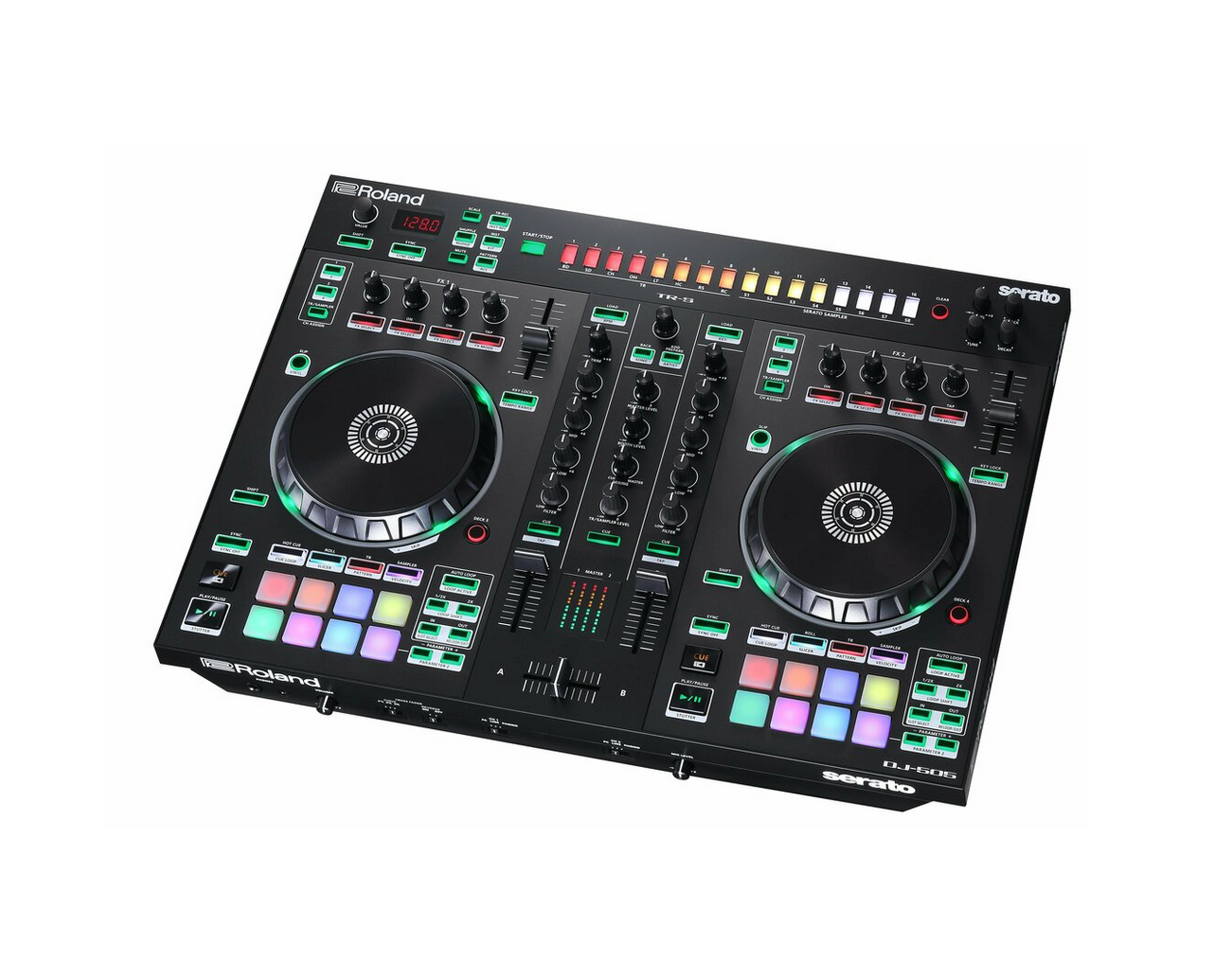 Eight dedicated pad controls for Serato DJ with Hot Cue, Roll, Slicer, TR, Pattern, and Sampler modes